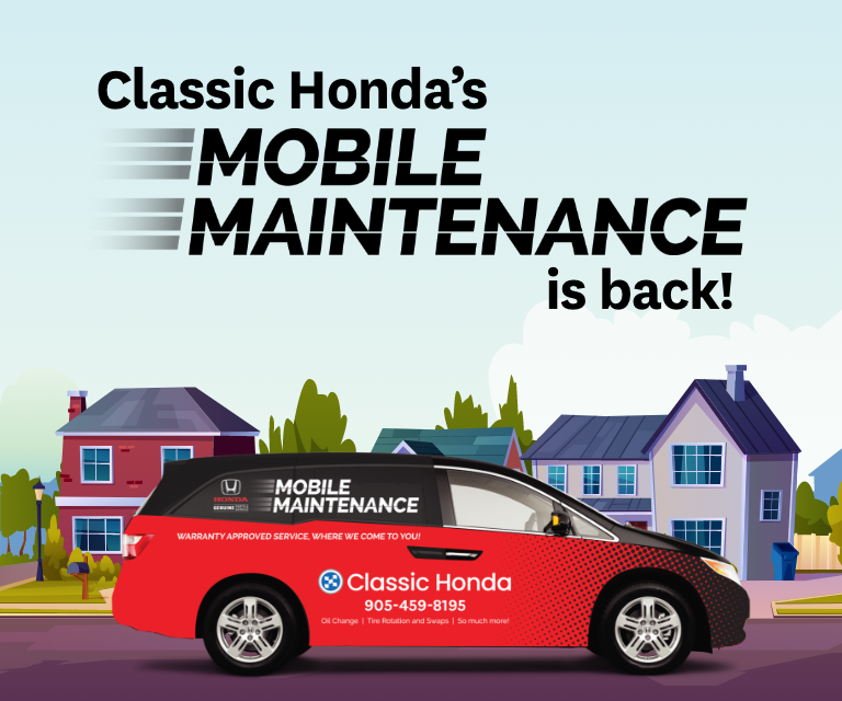 Introducing Classic Honda’s NEW Mobile Maintenance Service! We are the first and only Honda dealership in Canada to offer customers a Mobile Maintenance Service. Our brand new mobile maintenance van provides tire swaps, oil changes, tire rotations and more at your home or office. No waiting, no travel time!